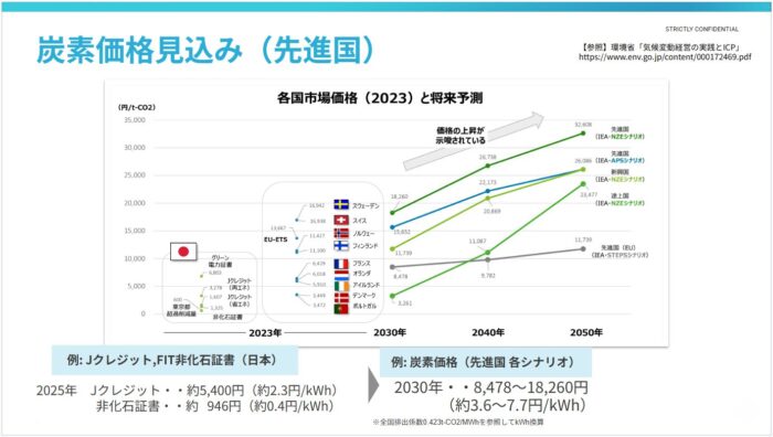 欧州などでは炭素価格はすでに高い水準になっていますが、世界的にも上昇傾向にあります。IEA(国際エネルギー機関)の予測では、2030年までに先進国の炭素価格は1トンあたり8,478円から18,260円(約3.6〜7.7円/kWh)に達する可能性が示されています。現在は比較的安価な日本やアジア諸国も、将来的なコスト増は避けられず、早期の対策がコスト削減に直結するといえます。