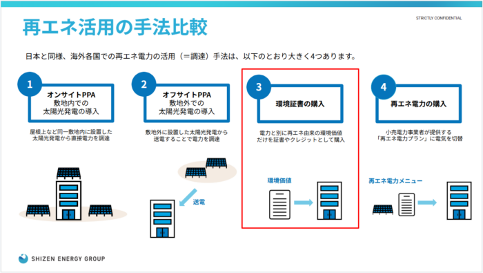 3. 環境証書の購入:電力とは別に、再エネ由来の「環境価値」だけを証書として購入する