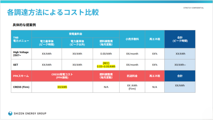 まずは現在契約をしている電力メニューとコストを分析します。その上で、再エネメニューであるGET(マレーシアの場合)の価格やPPAを導入した場合のコストを具体的にシミュレーションし、これらの選択肢を多角的に比較検討します。