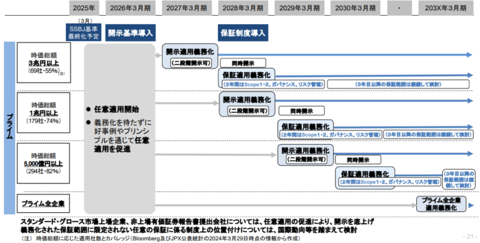 金融庁はSSBJについて、まず2027年3月期から時価総額3兆円以上の企業で適用を開始し、28年3月期に1兆円以上、2029年には5000億円以上、そして2030年3月期移行はプライム全企業へ拡大する案を示しています。