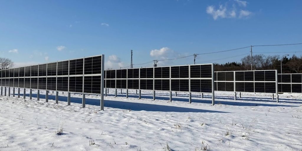 写真下:垂直式太陽光発電設備イメージ(2023年12月、自然電力が酪農学園大学敷地内に設置したもの)